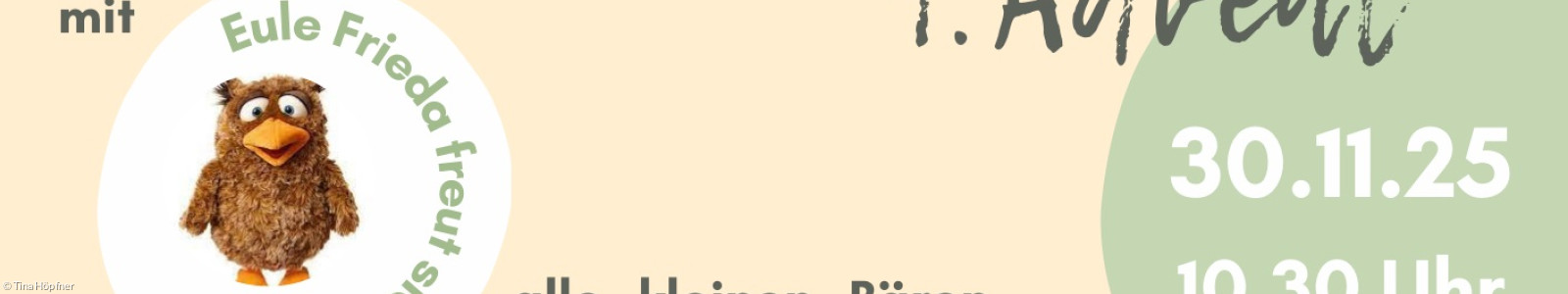 Das Vorbereitungsteam mit Eule Frieda freut sich auf alle kleinen Bären, Füchse, Häschen und Jäger. Alle Kinder sind eingeladen am Verkündigungsspiel spontan mitzuspielen. Im Anschluss gibt es Kirchcafé und evtl. eine Bastelaktion.